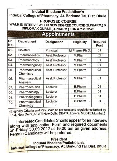 Indubai Bhadane Pratishthan’s Indubai College of Pharmacy (ICP) is a pioneering institution in Pharmaceutical education in Maharashtra. It is founded in 2022 by IBP’s of Institution (ICP), it will grow in stature and presently offers Bachelors of Pharmacy a 04 year degree course with 100 intake and Diploma in Pharmacy a 02 year Diploma course with 60 intake capacity in Pharmaceutical Sciences.
